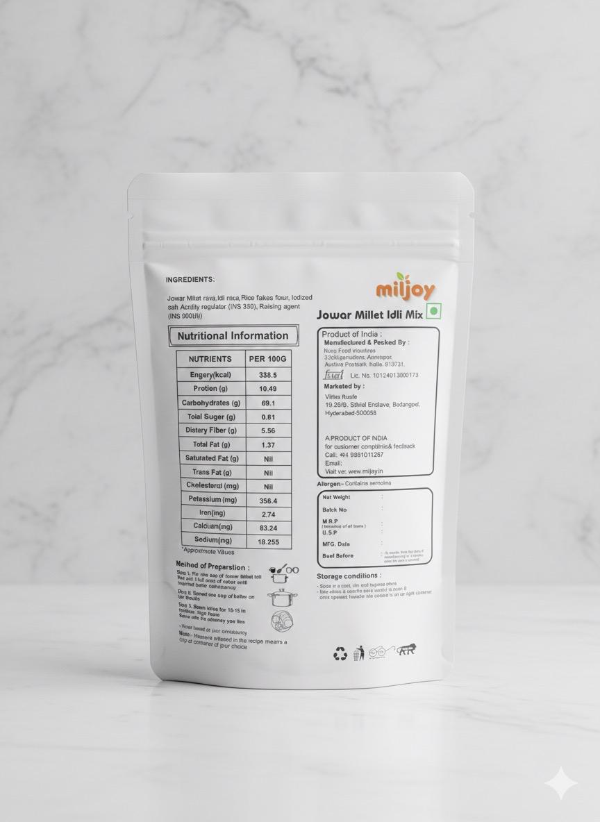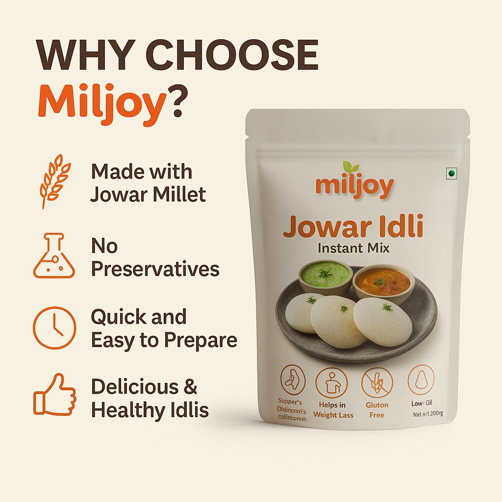 A nutritious Jowar Idli Mix made from pure sorghum flour. Gluten-free, rich in fiber, light on the stomach, and ready in minutes — perfect for a healthy breakfast for all age groups.