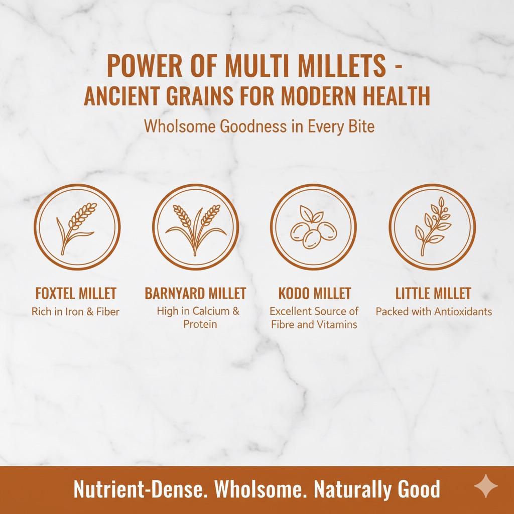 A wholesome, high-fiber Ragi Dosa Mix made with pure finger millet. Naturally gluten-free, rich in calcium, diabetic-friendly, and ready in minutes — a perfect healthy breakfast for all ages.