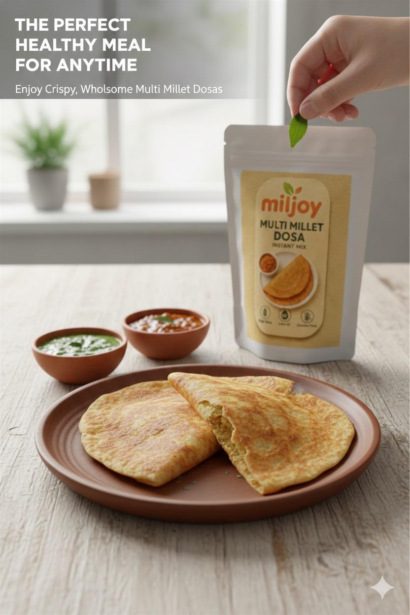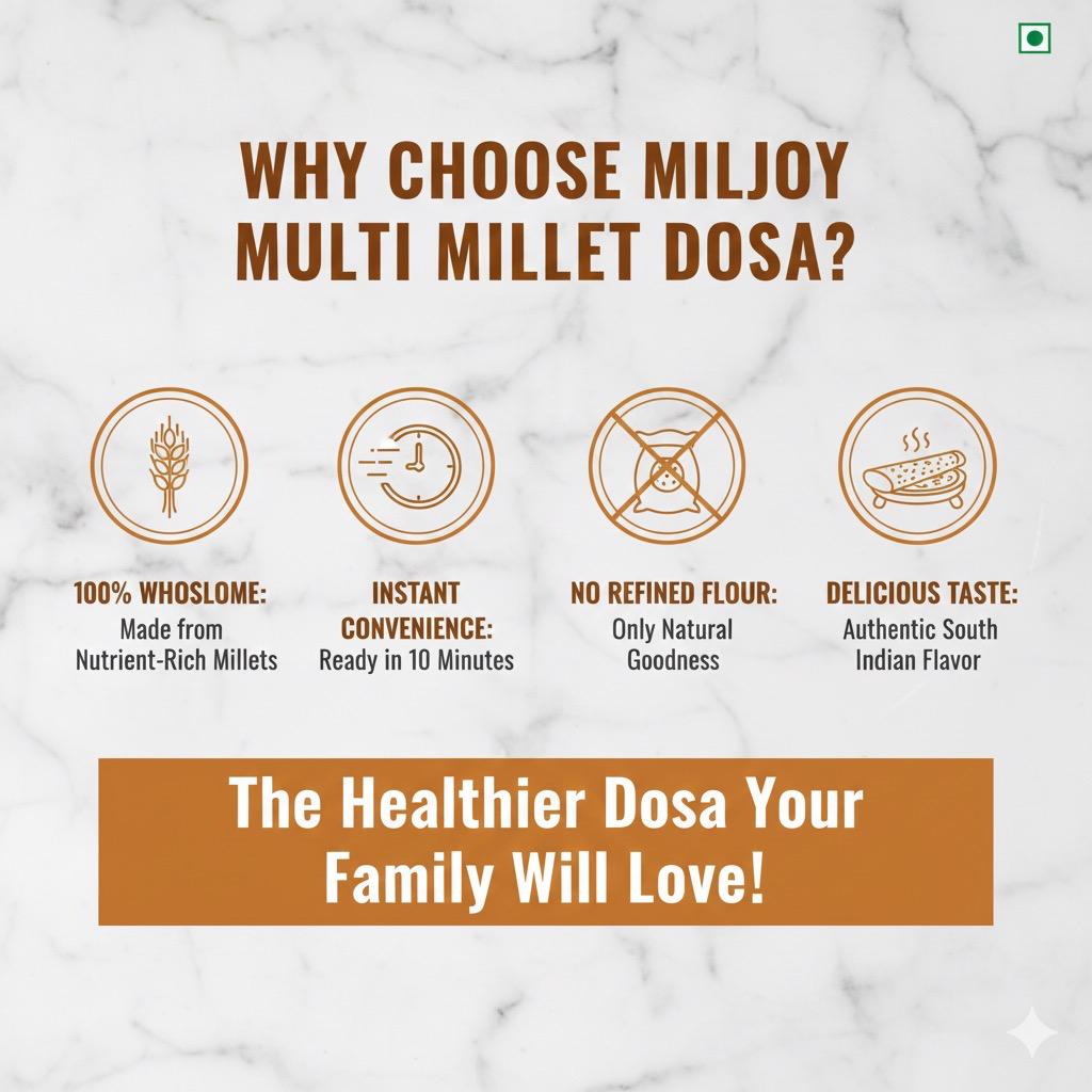 A nutritious blend of multi millets made for a wholesome, gluten-free breakfast. Miljoy’s Instant Multi Millet Dosa Mix is rich in fiber, protein and essential minerals